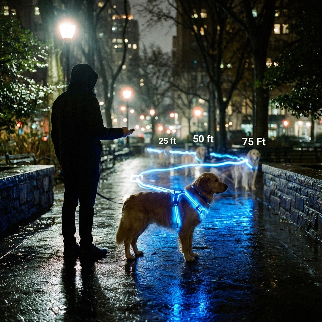 The Fix: Before your next walk, spend 10 minutes in your backyard or a safe open area testing the remote's range. Walk away from your dog (while they're secured) and test the LED controls at 25 feet, 50 feet, and 100 feet. Most quality remote-controlled pet LED systems work effectively up to 300 feet in open areas, but this drops to 75-100 feet in urban environments with buildings and interference.