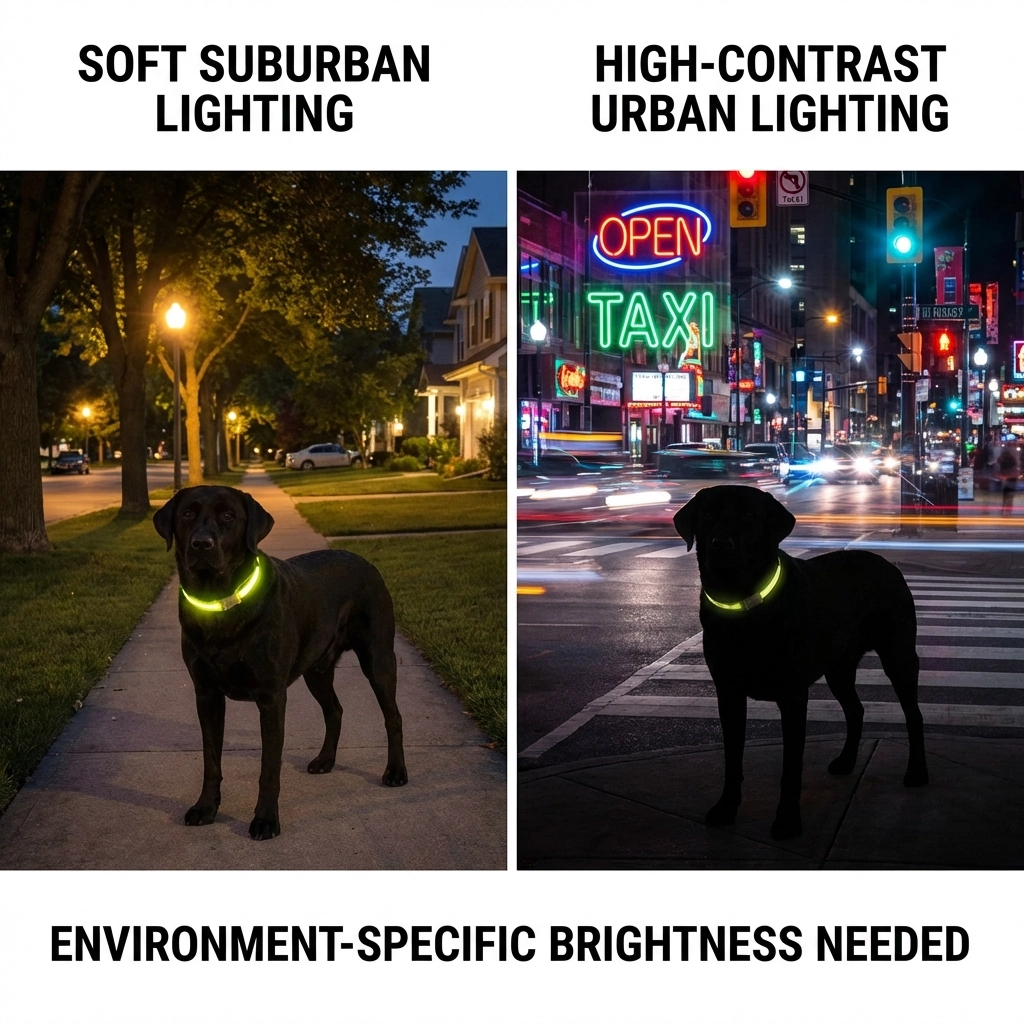 The Problem: Your LED collar worked perfectly on quiet suburban streets, so you assume the same brightness setting will work for everything. But when you're walking downtown during rush hour, competing with street lights, neon signs, and car headlights, your dog becomes nearly invisible again.