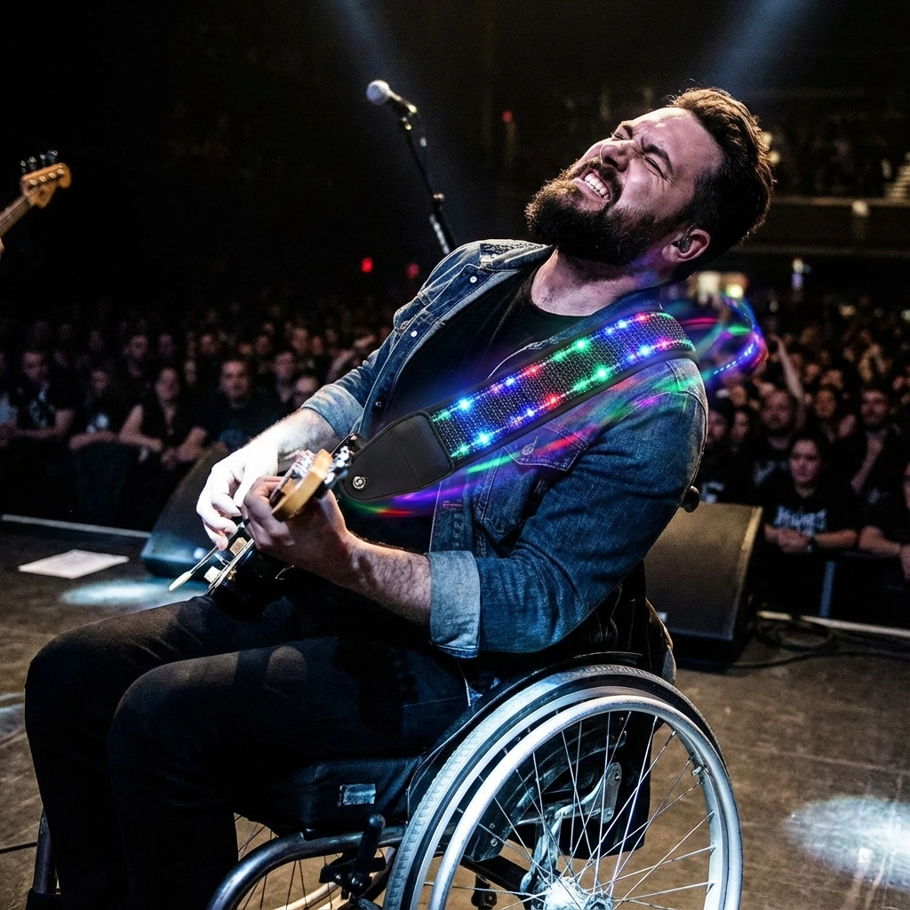 No major company designs guitar gear specifically with wheelchair musicians in mind. They design for them as an afterthought, not with them as experts. Your LED guitar straps already solve weight distribution, stability, and comfort issues: the exact problems wheelchair musicians face daily.